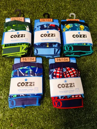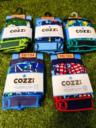 Lote de cinco paquetes calzoncillos para niño de la marca Cozzi ( 10 unidades) , talla 98/104. - Diseños variados y coloridos. - Tejido de algodón elástico para mayor comodidad. - Cintura elástica con logo.
