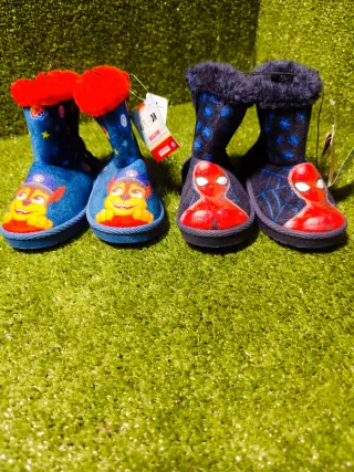 Conjunto de zapatillas infantiles con diseños de Paw Patrol y Spiderman. - Zapatillas Paw Patrol con detalles de estrellas y pompón rojo. - Zapatillas Spiderman con diseño de telaraña y borde de pelo sintético.