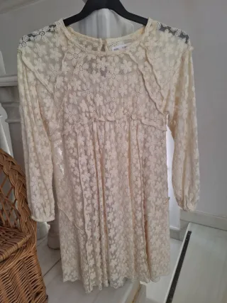 Vestido de ceremonia de Zara con un delicado encaje floral en color beige. Son 2 piezas. Muy bonito, usado sólo 1 vez. - Diseño de manga larga. - Cintura elástica. - Escote redondo con detalle de encaje. - Tejido semitransparente con motivos florales.