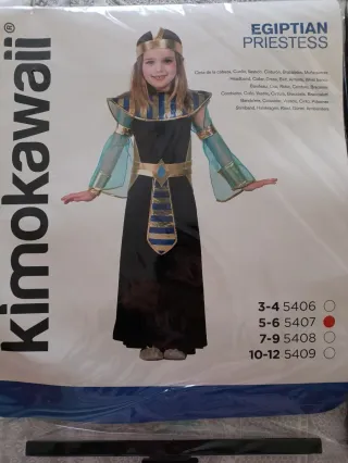 Disfraz de Sacerdotisa Egipcia de la marca Kimokawaii, ideal para fiestas de disfraces o Halloween. Este disfraz está diseñado para niñas. - Incluye diadema, cuello, vestido, cinturón, brazaletes y muñequeras. - Talla 5-6 años. - Color principal negro con detalles dorados y azules. En la parte delantera tiene algunos enganchones del velcro de los brazaletes. En la parte de atrás se le añadió una especie de capa de la misma tela de las mangas