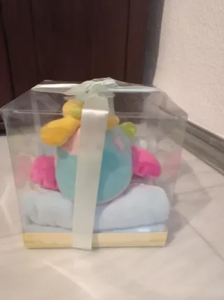 Precioso conjunto de manta y peluche para bebé, presentado en una caja transparente con lazo. - Peluche con forma de avión en tonos pastel. - Manta suave con estampado infantil. - Incluye un pequeño cojín rosa.