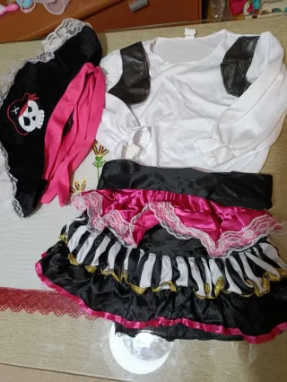 Disfraz de pirata para niña de la marca My Other Me. - Incluye sombrero, chaleco con camisa, falda, cinturón ( le falta la hebilla). - Talla 1-2A. - Diseño con rayas y detalles dorados.