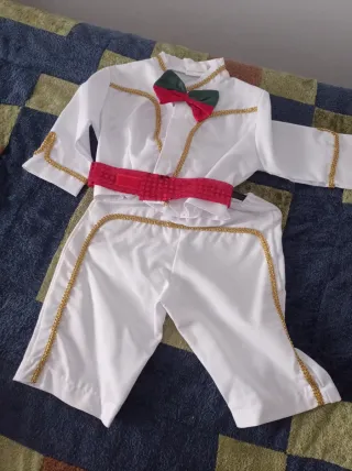 Disfraz de charro para niño, ideal para fiestas o eventos. - Traje blanco con detalles dorados. - Incluye pantalón y camisa. - Cinturón rojo. - Moño con detalles verdes y rojos.