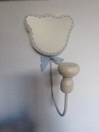 Bonita percha decorativa con forma de oso, ideal para habitaciones infantiles. Es de la marca Pasito a Pasito y tiene un diseño encantador con detalles en azul. - Forma de oso. - Ribete y lazo en color azul. - Gancho metálico.