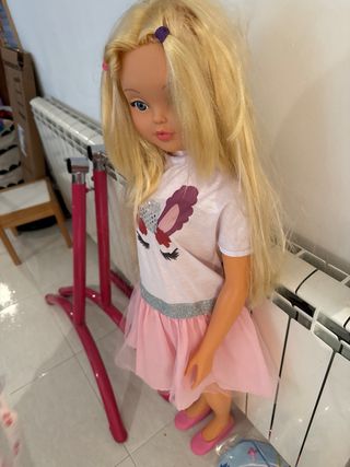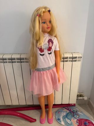 Muñeca de gran tamaño, mide 1 metro y 10 centímetros. - Cabello rubio largo. - Vestido rosa con detalles. - Zapatos a juego.