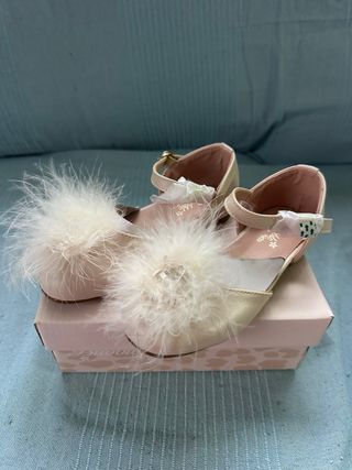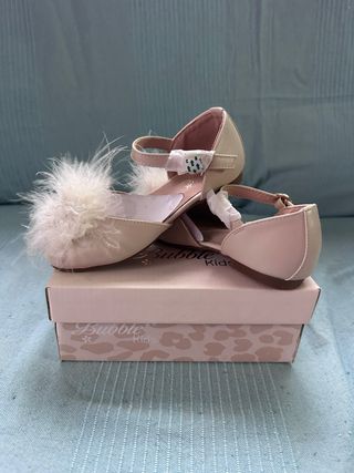 Sandalias de vestir para niña de la marca Bubble Kids. Perfectas para ocasiones especiales. - Color beige. - Adorno de pompón de plumas. - Cierre de tira con hebilla. - Suela de goma.