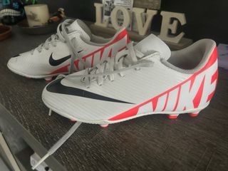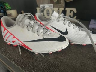 Botas de fútbol Nike con un diseño moderno y llamativo. - Color blanco con detalles en rojo. - Logo de Nike en los laterales. - Suela con tacos para césped. Talla 35. Tienen alguna marca del uso