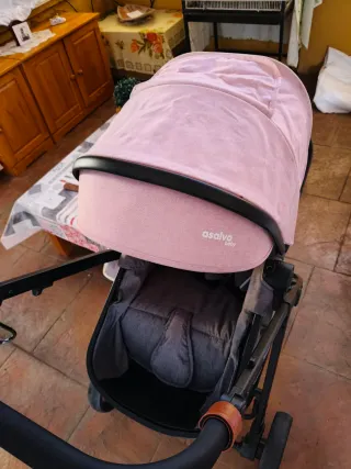 Carro de bebé de la marca Asalvo en color rosa. Ideal para paseos cómodos. Y con el bolso a juego - Capota amplia. - Asiento acolchado. - Diseño moderno.