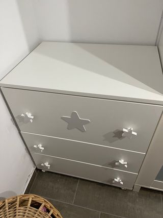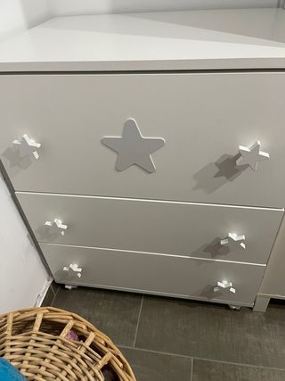 Mueble cambiador para bebé con un diseño encantador. - Acabado en color blanco. - Tiradores en forma de estrella. Usado muy poco La única cosa que tiene es que los dos cajones de abajo cuesta un poco abrir y cerrar pero cumple su función No tiene rascadas ni golpes y lleva ruedas con tope para poderlo mover von facilidad Medidas 73cm de ancho 52cm de fondo 87cm alto