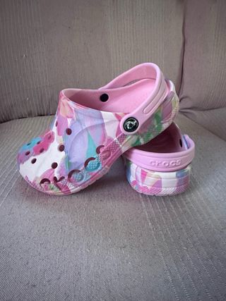 Zuecos Crocs con un divertido estampado floral en tonos rosas, morados y verdes. Perfectos para un look casual y cómodo. - Diseño abierto en la parte delantera para ventilación. - Tira trasera ajustable para mayor sujeción. - Suela con el logo de Crocs.