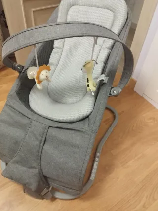 Mecedora de bebé en color gris, con un diseño moderno y cómodo. Incluye dos juguetes colgantes para entretener al bebé. - Tejido suave y acolchado. - Estructura metálica. - Dos juguetes de peluche incluidos.