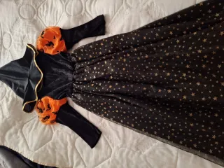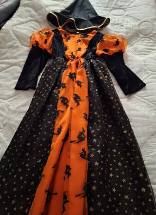 Disfraz de bruja para niña, perfecto para Halloween o carnaval. Incluye sombrero. - Vestido negro y naranja con estampado de estrellas y brujas volando. - Mangas abullonadas. - Detalle de fajín naranja. Talla 8-10