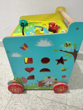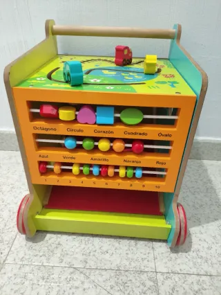 Corre caminos de madera con múltiples actividades para el desarrollo infantil. Presenta un diseño colorido y educativo. - Incluye ábaco con cuentas de colores. - Figuras geométricas para encajar. - Ruedas para empujar y caminar.