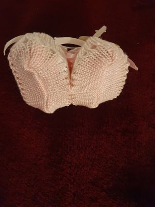 Preciosas botitas de bebé, tejidas a mano en color rosa. Perfectas para los primeros meses, también para muñeca. - Detalle de lazos en blanco y rosa. - Suela tejida. - Adorno con etiqueta de JOMUGA y globo aerostático.
