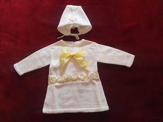 Precioso vestido de bebé, perfecto para ocasiones especiales. Confeccionado en tejido de punto blanco y adornado con un delicado lazo amarillo. - Diseño de punto. - Detalle de lazo amarillo en el pecho. - Adorno de encaje en la cintura.