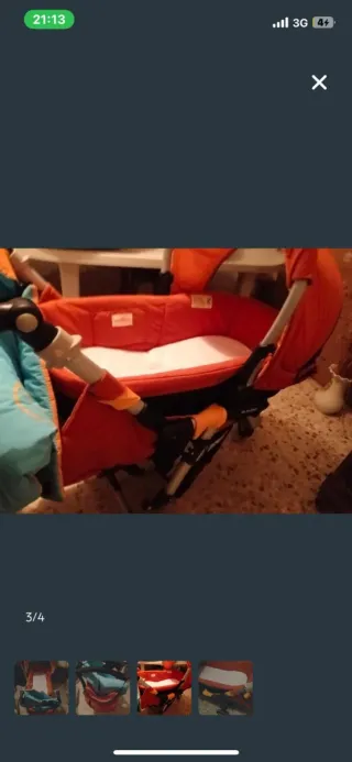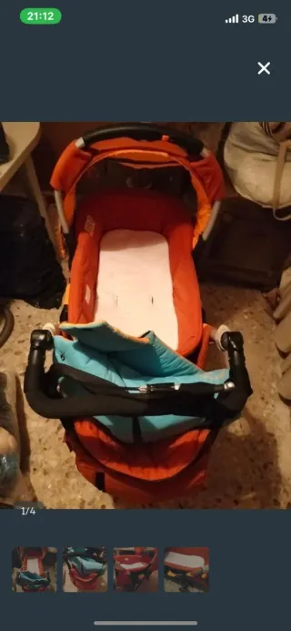 Carro de bebé en buen estado, con un diseño moderno y funcional. - Estructura principal en color naranja. - Asiento y capota en color azul. - Mango ergonómico.