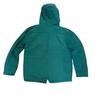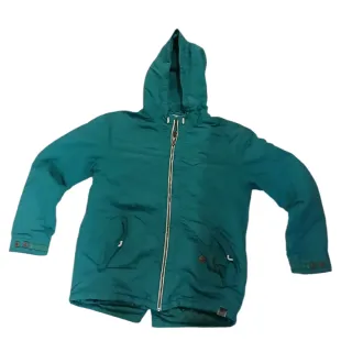 Chaqueta de color verde con capucha y cierre de cremallera. Los bolsillos tienen el interior roto. - Dos bolsillos delanteros con botón. - Puños ajustables con botones.