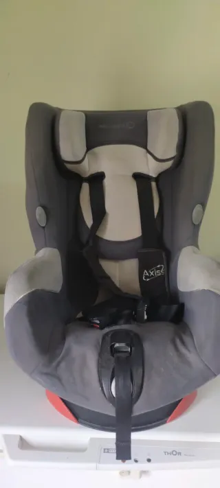 Silla de coche infantil de la marca Axis, en color gris y detalles en blanco. - no es Isofix. Va con el cinturón - Funda acolchada para mayor comodidad. - Base giratoria.