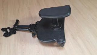 Accesorio universal para cochecito de bebé, ideal para niños de hasta 25 kg. Permite que el niño viaje de pie o sentado cómodamente. Con muy poco uso. - Plataforma antideslizante. - Asiento extraíble. - Correas de sujeción ajustables.