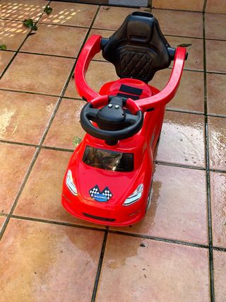 Correpasillos con forma de coche deportivo para bebés. Se le puede poner el reposa pies. En las fotos aparece quitado. Es magnífico, entre los 11 y 14 meses, nunca usé carrito de bebé, le llevaba en ese, él iba súper contento y feliz y si le apetecía andar, le quitaba el empujador y se ponía andar y ganaba musculatura. No lo puedo recomendar suficiente! Después se ha pasado directamente a la bicicleta, así que solo lo ha usado tres meses. Tiene las marcas de uso normal, está genial. Yo pagué 50 € por él, lo vendo con un 70% de descuento. Este precio es mucho más razonable, considerando el poco tiempo que lo va a usar.