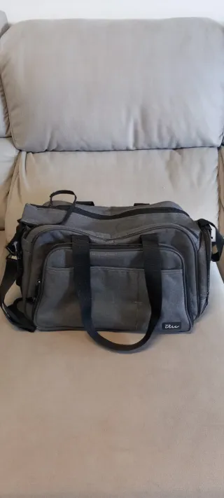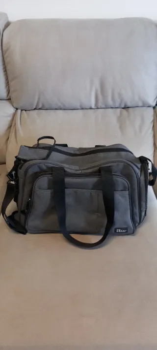 Bolso de color gris, ideal para llevar todo lo necesario para el bebé durante los paseos. - Compartimentos exteriores e interiores. - Asas de mano y correa para colgar. - Cierre con cremallera.