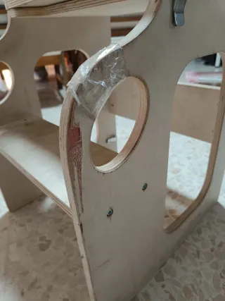 Torre de aprendizaje de madera, inspirada en la pedagogía Montessori. Se convierte fácilmente en mesa con asiento. Al ser de madera natural se le ven mucho los roces, pero se puede lijar o pintar y queda como nueva. Tiene un pequeño desconchón en una de las asas de fácil arreglo también.
