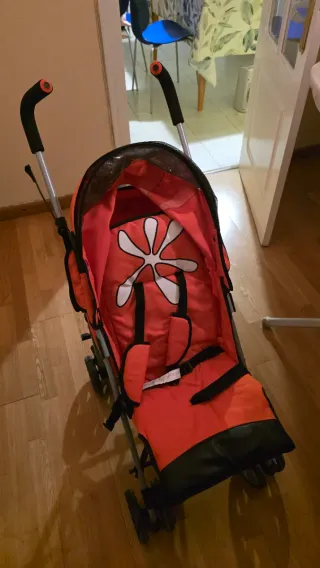 Carrito de bebé en color naranja, ideal para paseos. - Capota con visera. - Arnés de seguridad. - Ruedas para fácil movilidad. - espalda y piernas regulables