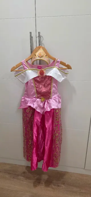 Disfraz de la Princesa Aurora de La Bella Durmiente de Disney. Ideal para fiestas o para jugar. - Vestido rosa con detalles dorados. - Escote con volantes blancos. - Parte superior con lentejuelas. - Incluye diadema a juego, original de la película En perfecto estado,tal cual fotos