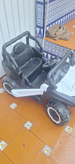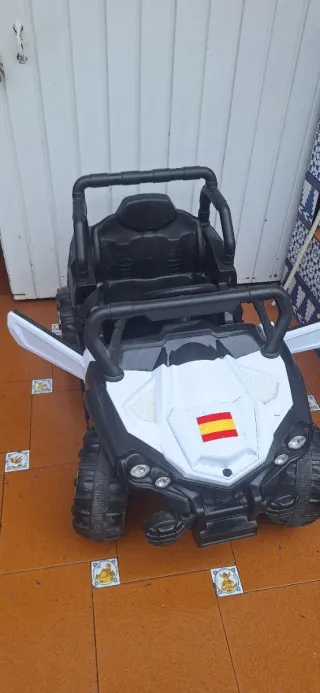 Se vende coche teledirigido en buen estado. Ideal para los más pequeños. - Diseño deportivo en blanco y negro. - Ruedas todoterreno. - Bandera de España en el capó. - mando teledirigido - cargador