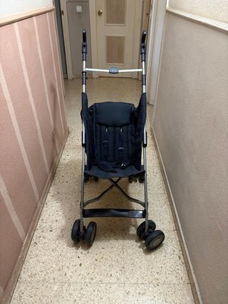 Silla de paseo ligera y fácil de plegar, ideal para transportar. - Estructura metálica. - Asiento acolchado azul marino - Ruedas dobles delanteras y traseras.