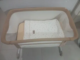 Minicuna de colecho Jane Babyside en color gris practicamente nueva. - Estructura de aluminio. - Laterales de malla transpirable. - Incluye colchón y sábana bajera. - Base reclinable.