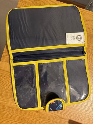 Portadocumentos con un divertido estampado espacial. - Diseño con cohetes, planetas y estrellas. - Cierre con solapa. - Ribete de color amarillo.