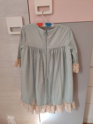 Precioso vestido para niña, ideal para ocasiones especiales. Su diseño combina dulzura y elegancia. -Talla 6 años - Color azul claro con pequeños topos. - Mangas largas con detalle de encaje en los puños. - Falda con capa de tul y remate de encaje. - Adorno de lazo en la parte delantera.