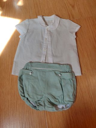 Conjunto de dos piezas para bebé de 9 meses. - Camisa blanca de manga corta con cuello - Pantalón corto verde con tirantes