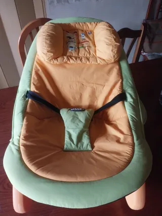 Hamaca para bebé en tonos naranja y verde. Perfecta para el descanso y entretenimiento del pequeño. - Cojín reposacabezas. - Arnés de seguridad. - Base con sistema de balanceo.