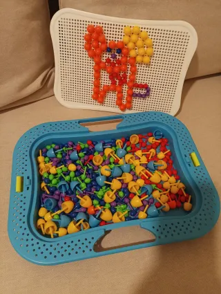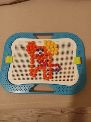 Juego de mesa de actividad con clavijas de colores para crear diseños. - Tablero blanco con rejilla. - Marco azul. - Clavijas de colores: naranja, amarillo, morado y azul.