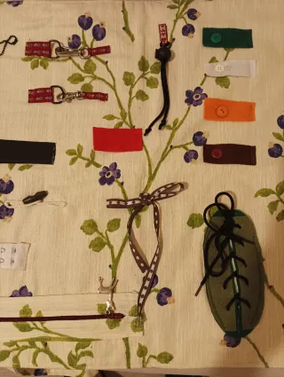 Especie de maletín hecho a mano ,con todos los cierres a aprender. ,cremallera,zapatos ,lazo,botón.....
