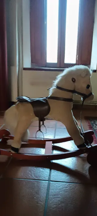 Caballo balancín de peluche, ideal para la decoración de habitaciones infantiles o como juguete. Le falta un palo de madera en un lateral, precio negociable - Peluche de color beige. - Sillín de cuero sintético. - Crin y cola blancas. - Base de balancín de madera.