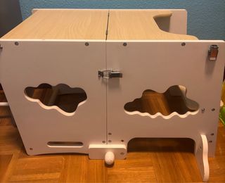 Mesa de aprendizaje estilo Montessori con un diseño encantador. - Estructura principal en color blanco. - Superficie superior de madera clara. - Detalles con recortes en forma de nube. - Puerta frontal con cierre de seguridad.