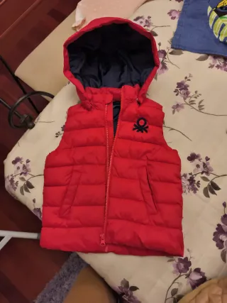 Chaleco acolchado para niño de la marca Colors of Benetton. Talla 104 3-4 años aunque vale hasta 5 años - Color rojo vibrante. - Diseño con capucha. - Cierre de cremallera. - Logo de Benetton bordado.