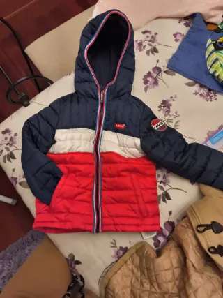 Cazadora infantil de la marca Levi's en talla 6 años. Perfecta para los días más frescos. - Diseño acolchado. - Combinación de colores azul marino, blanco y rojo. - Capucha integrada. - Cierre de cremallera. - Parche de la marca en la manga.