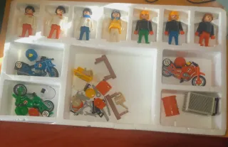 Set de Famobil ( Playmovil ) System con temática de motos y figuras ( 6 clic + 1 clack ) , vintage para coleccionistas , fabricado por FAMOSA año 1974 ...Incluye varias figuras de pilotos y mecánicos. Varias motocicletas de diferentes colores. Accesorios como bidones de gasolina, herramientas y casco. Tal cual las fotos