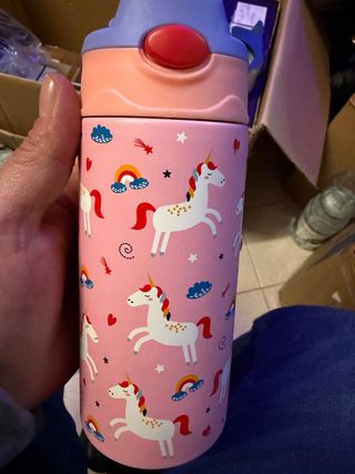 Botella térmica infantil con un divertido diseño de unicornios. - Color rosa. - Ilustraciones de unicornios, arcoíris y nubes. - Tapa con botón y asa. - Ideal para llevar bebidas frías o calientes.