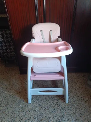 Trona de bebé en color rosa y blanco, con cinturón de seguridad y bandeja. - Asiento acolchado. - Bandeja extraíble. - Estructura resistente.