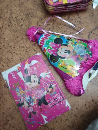 Set de decoración temática de Minnie Mouse para fiestas de cumpleaños. - Incluye varios elementos decorativos con los personajes de Minnie Mouse y Daisy. - Diseño en tonos rosas y morados con lunares y coronas. - Ideal para crear un ambiente festivo y divertido.