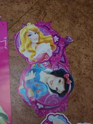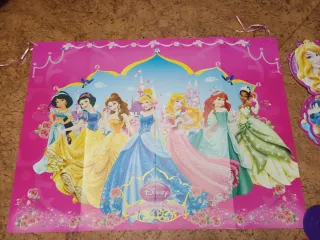 Preciosa decoración de las Princesas Disney, perfecta para una fiesta de cumpleaños. - Incluye varias princesas como Cenicienta, Bella, Ariel, Jasmine, Aurora y Tiana. - Diseño vibrante con castillos y flores. - Ideal para crear un ambiente mágico.