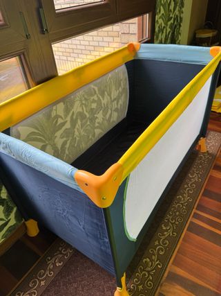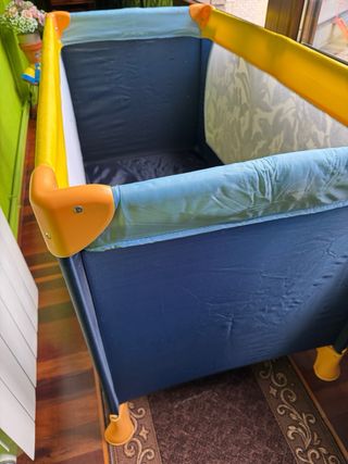 Cuna de viaje portátil y fácil de montar. - Estructura resistente. - Laterales de malla transpirable. - Colores azul y amarillo.