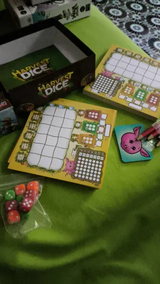 Juego de mesa Harvest Dice de Danny Devine. - Ilustraciones coloridas de temática granjera. - Incluye componentes para jugar.