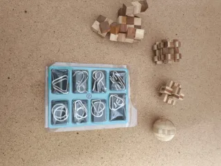 Conjunto de rompecabezas de metal y madera. - Incluye 8 rompecabezas de metal en un estuche. - Incluye 4 rompecabezas de madera de diferentes diseños. - Incluye 1 rompecabezas de madera esférico.