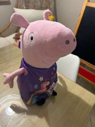 Adorable peluche de Peppa Pig, perfecta para los fans de la serie. - Peppa Pig lleva una corona dorada. - Viste un vestido morado con estampado de unicornio y arcoíris. - Hecho de material suave y tierno.